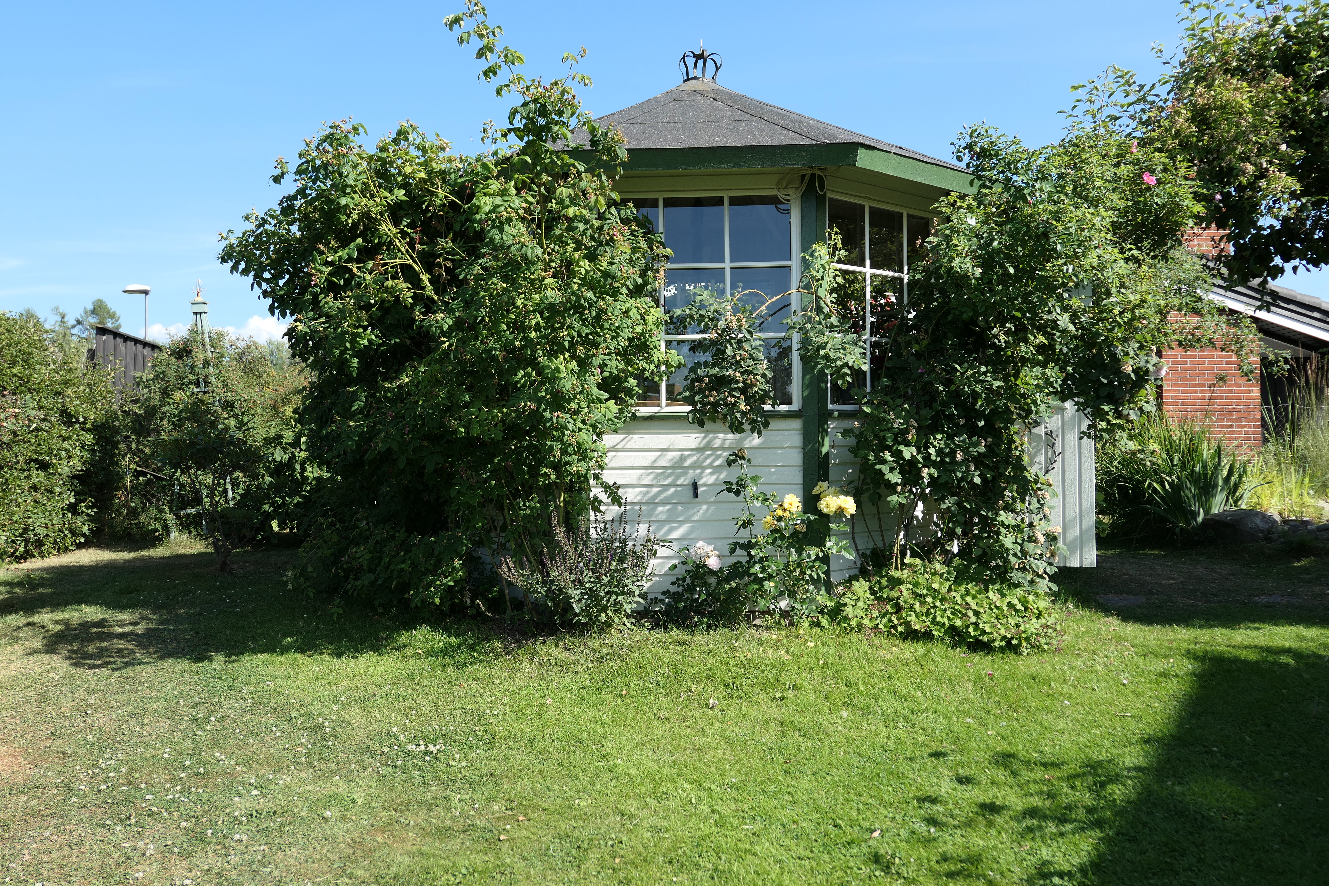 Et sjarmerende lysthus godt "innpakket" i roser. Foto: Kari Gjertrud Dølgaard