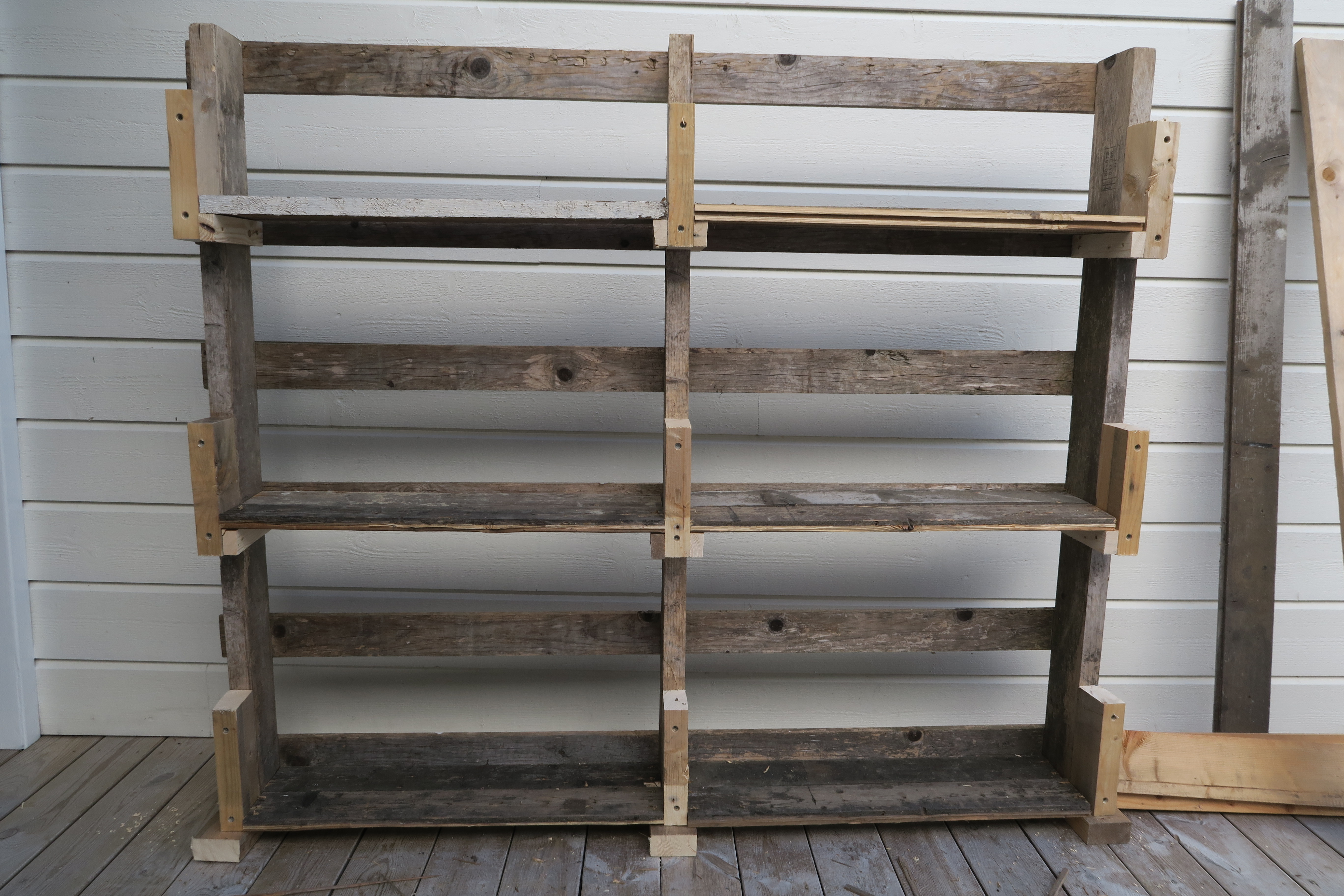 Tadaa! Ferdig plantehylle, men den ser litt rufsete ut, så vi sliper av skitt og flis slik at vi kan male den i etterkant.