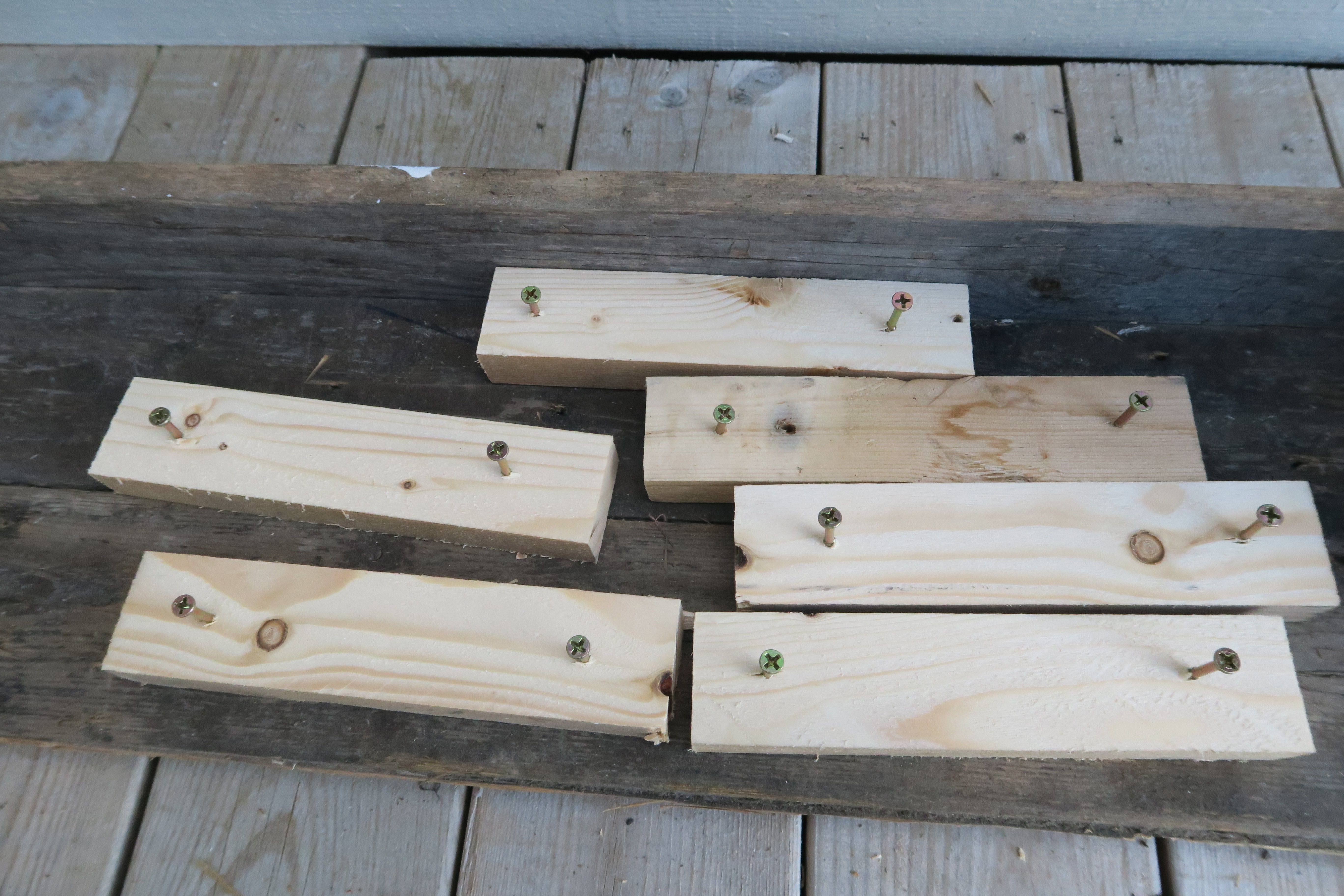 Sag til klosser av materialet du har gjenvunnet. De behøver ikke være like solide som dem vi har laget, men brede nok til at treverket ikke sprekker når du setter inn skruen.