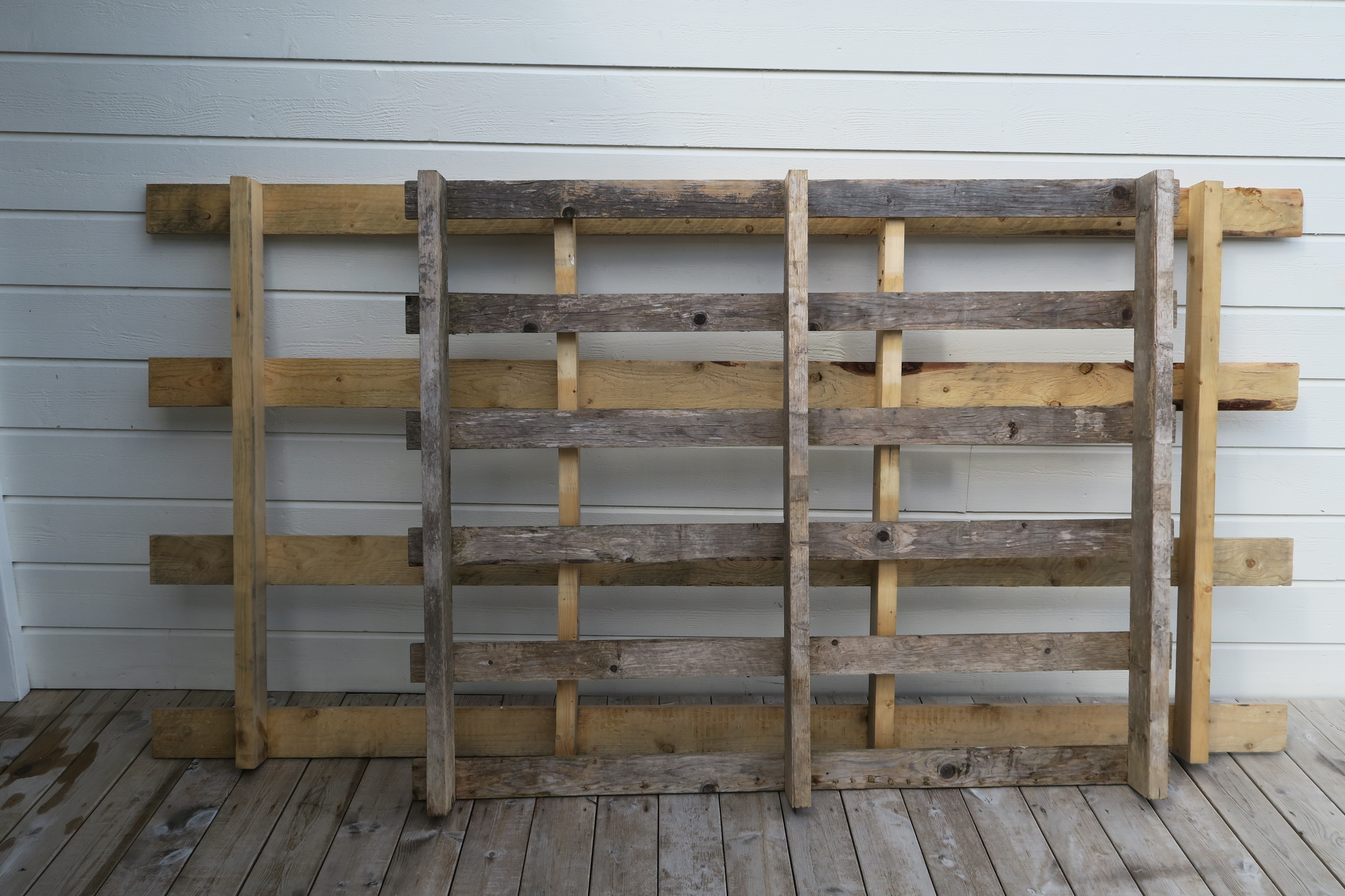 Vi fikk tak i to gamle paller. Den ene skal bli rammen til selve hyllen, og den andre skal demonteres og brukes som materiale.
