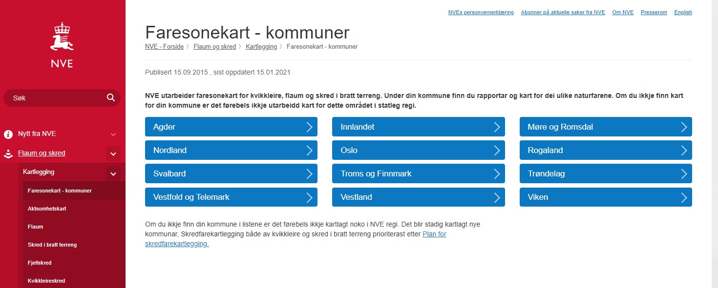 På NVEs nettsider finner du fylkesvise oversikter hvor du kan du sjekke om utredninger er gjort i ditt område. Skjermdump fra NVE.