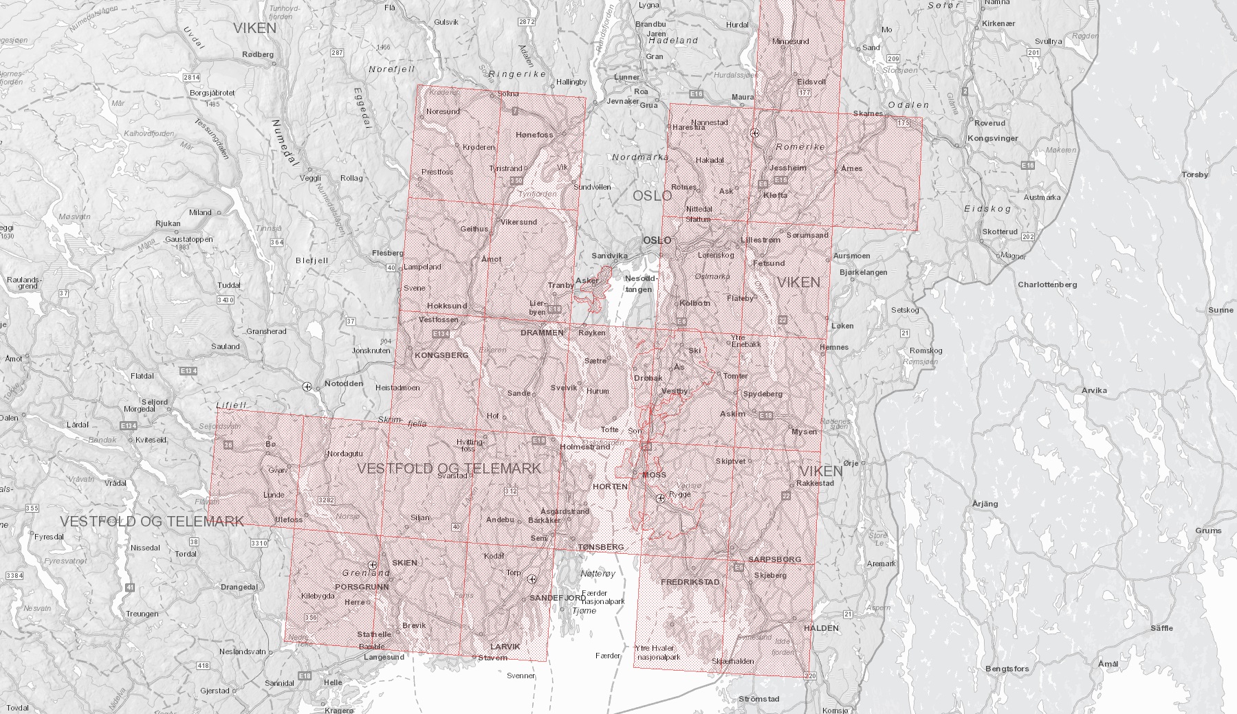 Kart i NVEs database viser områder som allerede er kartlagt for kvikkleire, her Østlandsområdet. Skjermdump NVE.