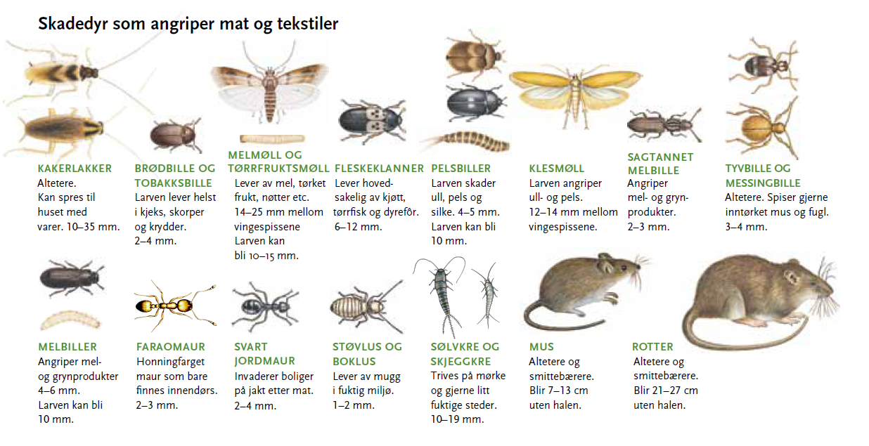 Insekter som melbiller, kakerlakker, brødbille, tobakksbille, melmøll, tørrfruktmøll, fleskeklanner, pelsbille, klesmøll, tyvbille, mus og rotter kan derimot gjøre stor skade på mat og tekstiler. De kan også være bærere av smittsomme sykdommer som salmonella og listeria, ødelegge mat og jordbruksvarer, samt infisere dyrefor.