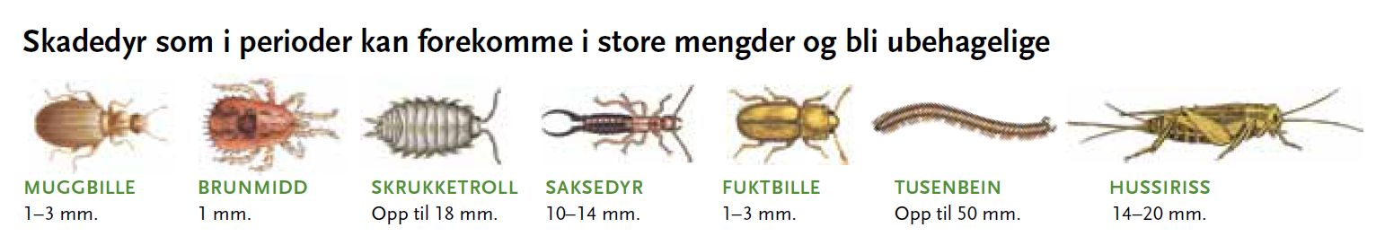 De fleste skadedyrene vi finner hjemme er helt ufarlige, selv om mengder av dem kan oppleves ubehagelig. Eksempler på dette er sølvkre, muggbille, brunmidd, skrukketroll, saksedyr, fuktbille, tusenbein og hussiriss.